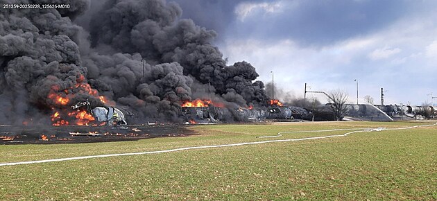 Hasiči zasahují v Hustopečích nad Bečvou na Přerovsku, kde z poškozené železniční cisterny na nákladním vlaku uniká benzen a hoří.