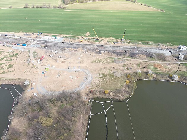 Letecký pohled na místo vykolejení nákladního vlaku převážejícího benzen šest týdnů od havárie (10. dubna 2025)