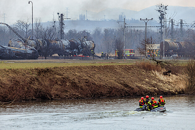 Hasiči přečerpávají chemikálii z poškozených vagonů po požáru vykolejeného cisternového vlaku převážejícího vysoce toxický benzen. Na místě stále likvidují i další následky nehody. (1. března 2025)