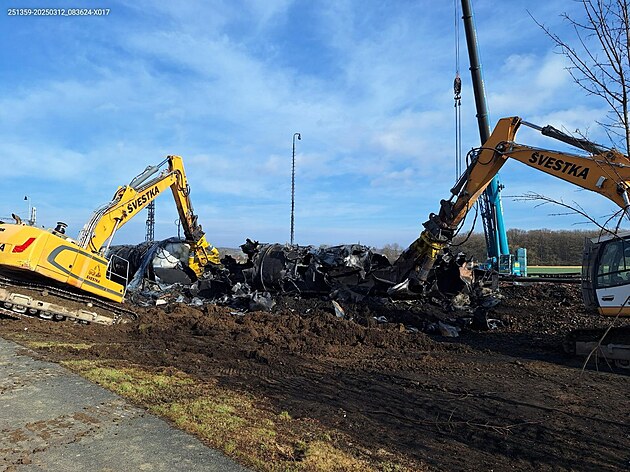 Hasiči Správy železnic na místě nehody v Hustopečích and Bečvou pokračují v odstraňování vraků železničních cisteren za asistence specializovaných firem.