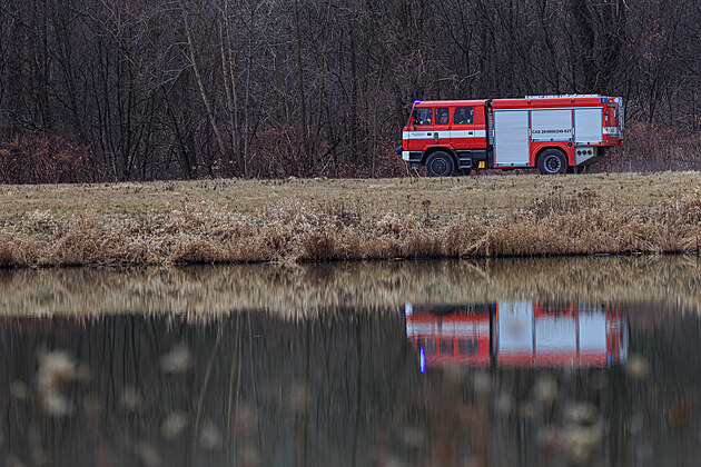 Hasiči přečerpávají chemikálii z poškozených vagonů po požáru vykolejeného cisternového vlaku převážejícího vysoce toxický benzen, 1. března 2025.