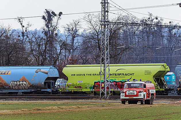 Hasiči přečerpávají chemikálii z poškozených vagonů po požáru vykolejeného cisternového vlaku převážejícího vysoce toxický benzen. (1. března 2025)
