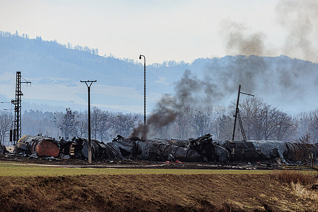 Hasiči přečerpávají chemikálii z poškozených vagonů po požáru vykolejeného cisternového vlaku převážejícího vysoce toxický benzen. (1. března 2025)