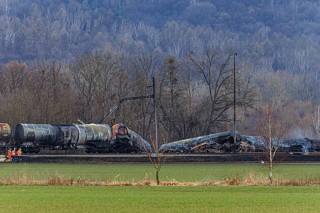 Hasiči přečerpávají chemikálii z poškozených vagónů po požáru vykolejeného cisternového vlaku převážejícího vysoce toxický benzen. Na místě stále likvidují i další následky nehody. (1. března 2025)