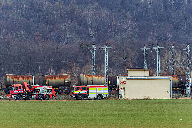 Hasiči přečerpávají chemikálii z poškozených vagónů po požáru vykolejeného cisternového vlaku převážejícího vysoce toxický benzen. Na místě stále likvidují i další následky nehody. (1. března 2025)
