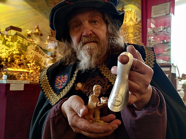 Jaroslav Beneš s vyřezanou figurkou Tomáše Bati