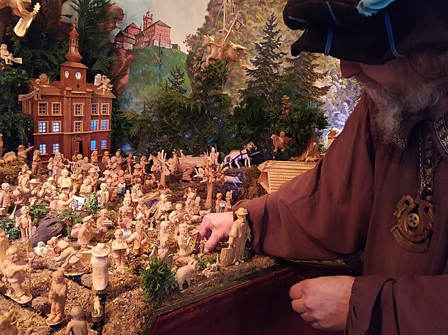 Řezbář Jaroslav Beneš umísťuje do svého betlému nové figurky.