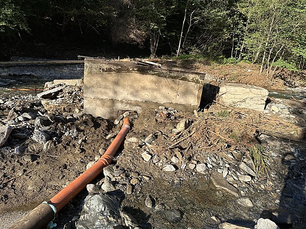 Pohled na povodní poškozený jímací objekt na horském potoku, z něhož odtéká voda do úpravny vody v jesenické místní části Adolfovice.