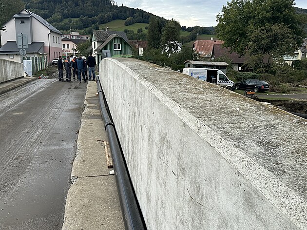 Ukázka použití suchovodů po povodni, která se prohnala Jesenickem v září 2024. Provizorní vodovodní sítě jsou tvořené potrubím vedeným po povrchu.