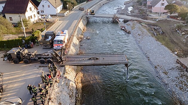 Snímek z dronu zachycující instalaci provizorního mostu přes řeku Bělou v České Vsi na Jesenicku