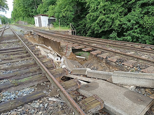 Koleje na nádraží v Žulové podemlela při povodni rozvodněná říčka Vidnavka.