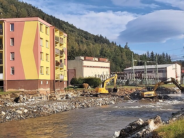Do odstraňování škod se po povodních muselo ve velkém pustit i Povodí Moravy, například v Hanušovicích na Šumpersku.