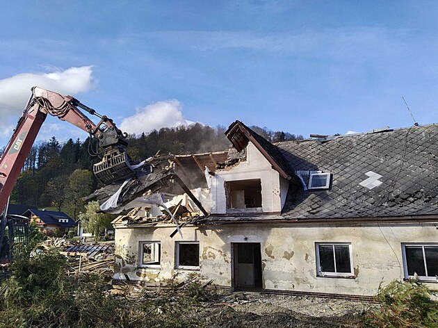 Demolice domu na pozemku u řeky Bělé zasaženého povodněmi v Šumperské ulici v Jeseníku. Právě takové pozemky v aktivní záplavové zóně chce stát získat.