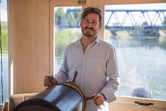 Šimon Pelikán u kormidla výletní lodi vozící výletníky po řece Moravě v Olomouci.