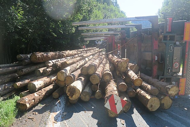 Řidič nákladní soupravy naložené dřevem nezvládl zatáčku, tahač s návěsem skončil převrácený v protisměru a náklad vysypaný na silnici a v příkopu. (21. července 2025)