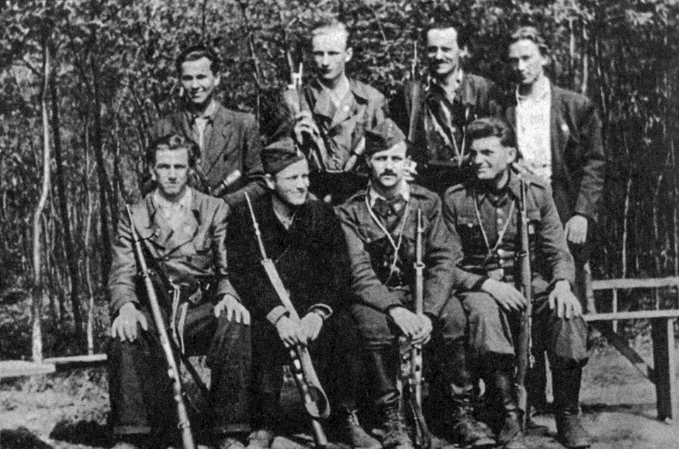 Historický snímek skupiny partyzánů oddílu Moskalenko-Dolinov z března 1945, jejímž členem byl i Josef Jedlička (sedící zcela vlevo dole).
