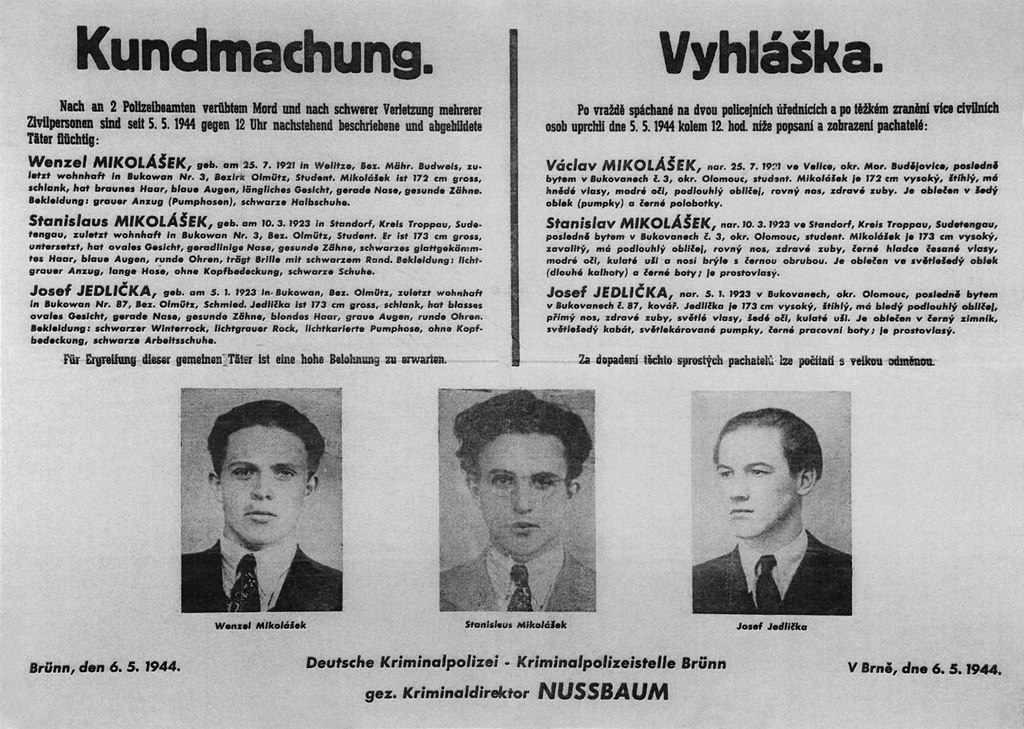 Vyhláška z května 1944 oznamující vydání zatykače na protinacistické odbojáře včetně Josefa Jedličky, jehož životní příběh přináší nová kniha Stopy paměti.