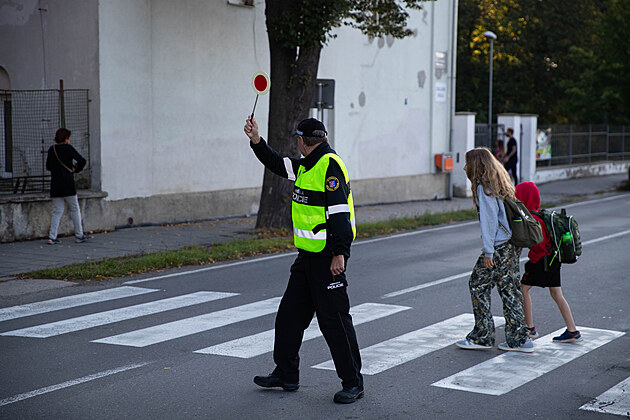 Strážníci 1. září 2025 dohlíželi na bezpečnost školáků ve Svatoplukově ulici v Olomouci.