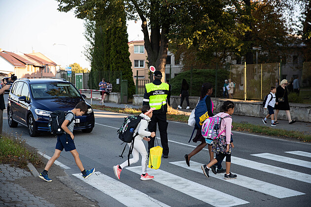 Strážníci 1. září 2025 dohlíželi na bezpečnost školáků ve Svatoplukově ulici v Olomouci.