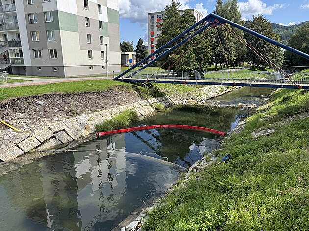 V korytě řeky Staříč v Jeseníku se převrátil kráčející bagr. Na břeh mu pomáhali hasiči a jejich technika. (6. 8. 2025)