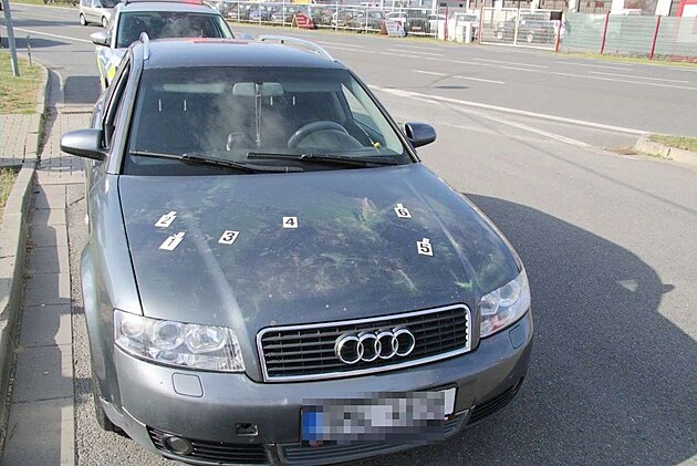Vozidlo, které nabralo na kapotu dva muže z ochranky.