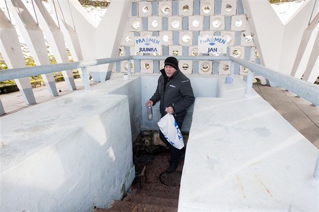 Jeden z návštěvníků lázní Skalka na Prostějovsku si nabírá léčivou vodu z pramenů Julinka a Jan.