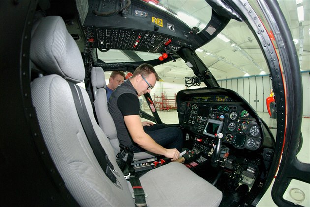 Pohled do pilotní kabiny vrtulníku Agusta A109 K2 slovenské společnosti Air Transport Europe, která začne od ledna 2017 provozovat leteckou záchrannou službu z olomouckého heliportu.