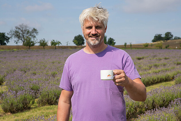 Lukáš Drlík pózuje před levandulovým polem.