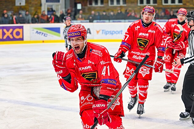 Prostějovský Jakub Babka se raduje z branky do sítě Přerova.