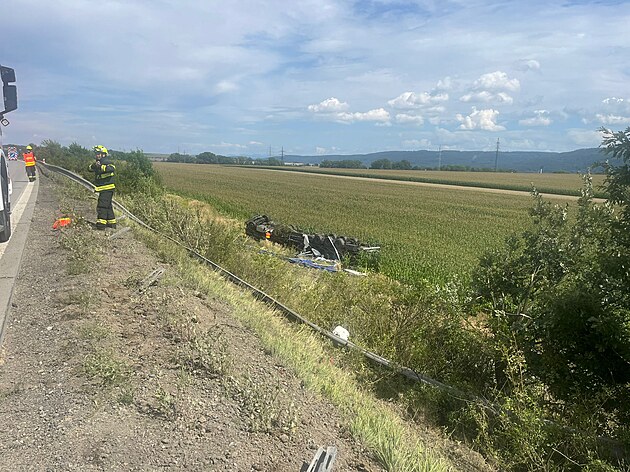 Na dálnici D1 u Lipníku nad Bečvou havaroval kamion, skončil převrácený v poli.