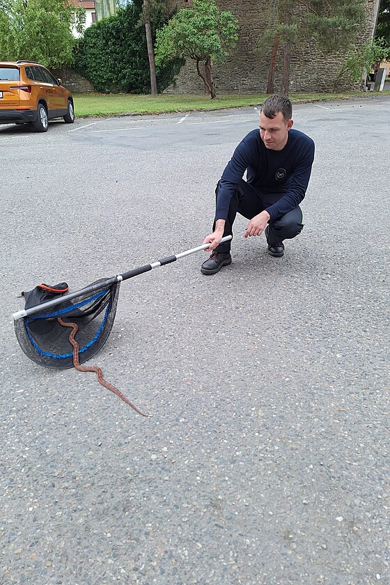 Hasiči odchytli kousek od své stanice v Litovli velkého cizokrajného hada, zřejmě užovku červenou. (16. června 2025)