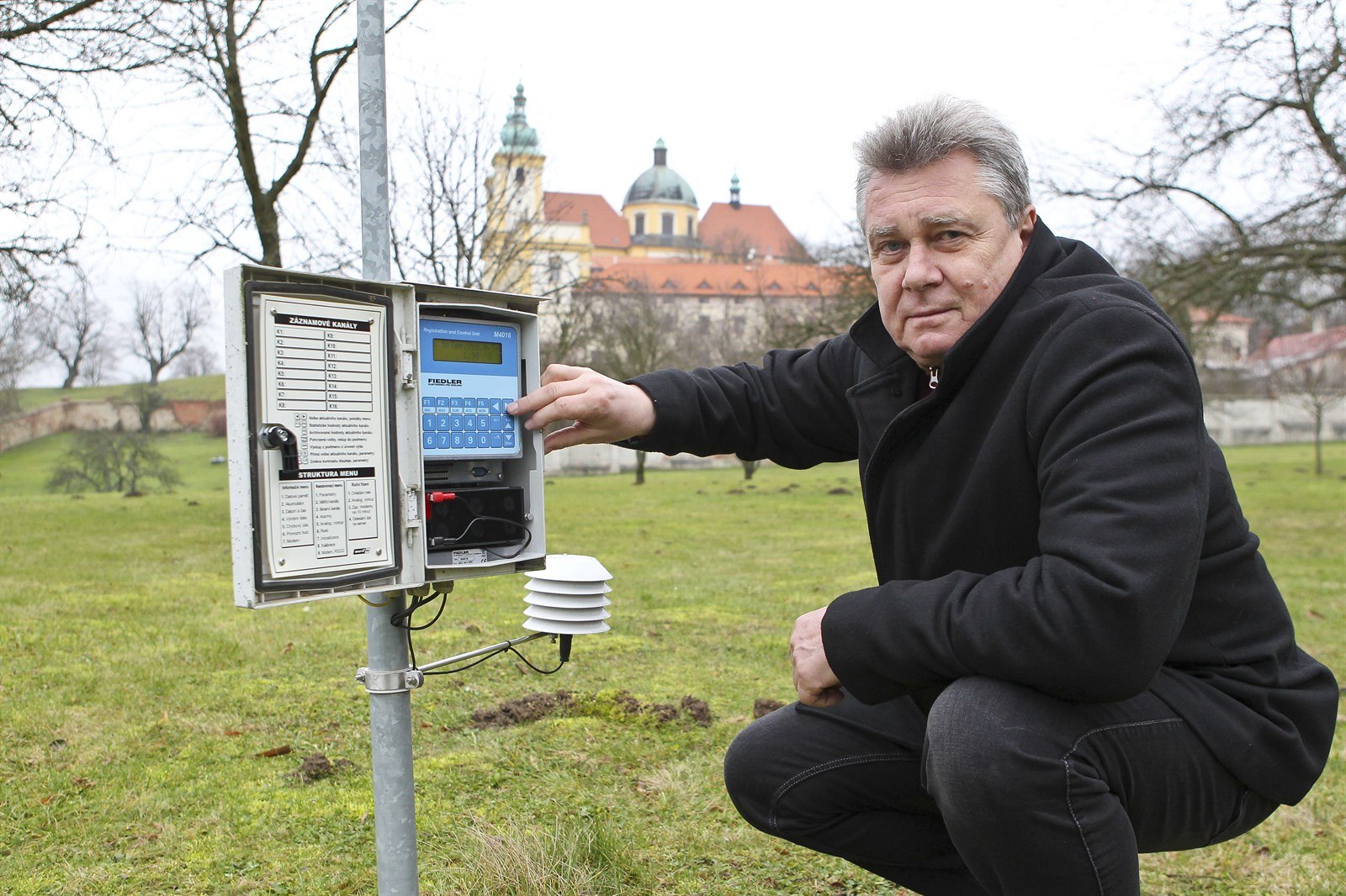 Miroslav Vysoudil z katedry geografie Univerzity Palackého u jedné z meteostanic, která je součástí nového varovného systému Olomouce před silným větrem či povodněmi.
