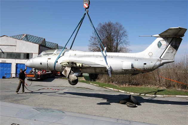 Vykládání nových exponátů olomouckého Leteckého muzea v Olomouci, které sem po částech dorazily 15. a 16. dubna 2013. Na snímku prototyp letounu Aero L-29 Delfín. Jde o první československé proudové letadlo.
