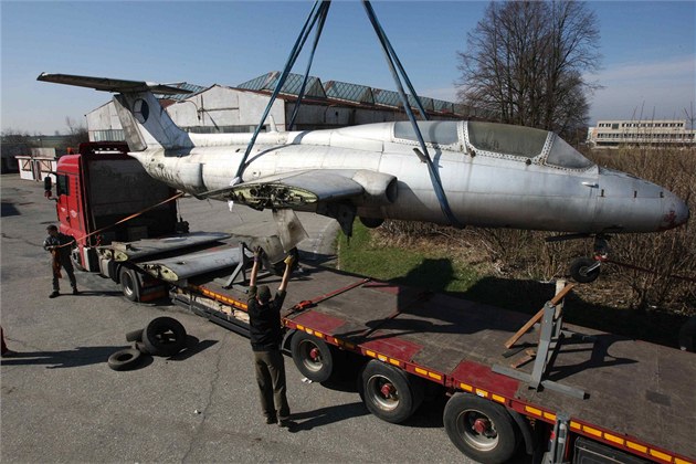 Vykládání nových exponátů olomouckého Leteckého muzea v Olomouci, které sem po částech dorazily 15. a 16. dubna 2013. Na snímku prototyp letounu Aero L-29 Delfín. Jde o první československé proudové letadlo.