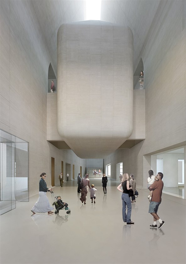 Vizualizace vnitřních prostor Středoevropského fóra jak je pro olomoucké Muzeum umění navrhli architekti Jan Šépka a Václav Derner.