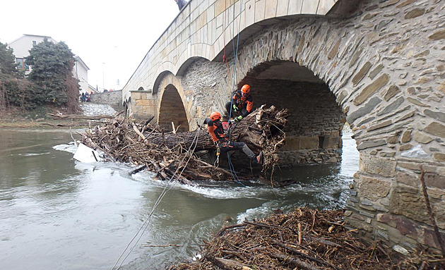 S odklízením naplavenin museli hasiči počkat, až se sníží průtok v řece. Dřevo se odstraňovalo v úterý a ve středu.