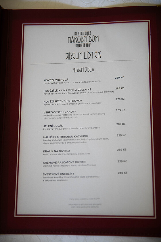 Jídelní lístek restaurace Národní dům v Prostějově. (28. 8. 2025)