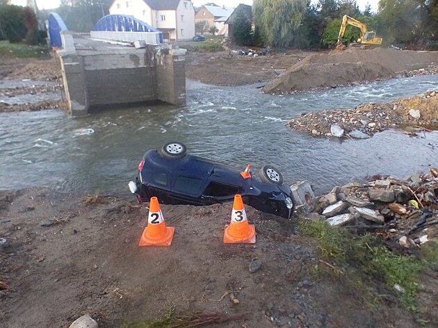 Řidič v Mikulovicích na Jesenicku nestihl zabrzdit před chybějícím kusem silnice vůz poté skončil převrácený na boku v korytě řeky.