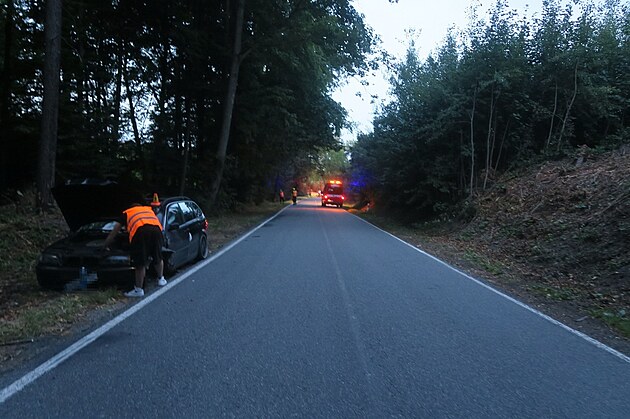 Následky dopravní nehody mezi obcemi Malé Hradisko a Stínava na Prostějovsku (28. srpna 2025)