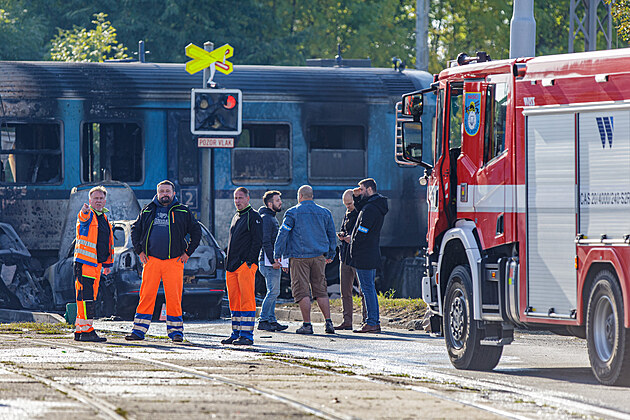 Na železničním přejezdu v Olomouci narazil osobní vlak do kamionu, při následném požáru shořelo i poblíž stojící osobní auto. (17. října 2023)