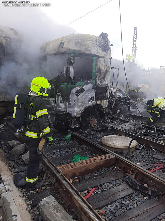Na železničním přejezdu v Olomouci narazil osobní vlak do kamionu, při následném požáru shořelo i poblíž stojící osobní auto. (17. října 2023)