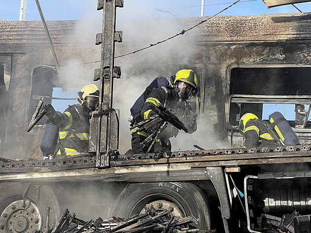 Na železničním přejezdu v Olomouci narazil osobní vlak do kamionu, při následném požáru shořelo i poblíž stojící osobní auto. (17. října 2023)