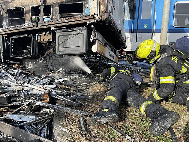 Na železničním přejezdu v Olomouci narazil osobní vlak do kamionu, při následném požáru shořelo i poblíž stojící osobní auto. (17. října 2023)