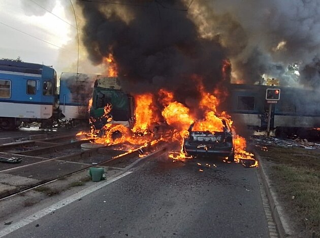 Na železničním přejezdu v Olomouci narazil osobní vlak do kamionu, při následném požáru shořelo i poblíž stojící osobní auto. (17. října 2023)