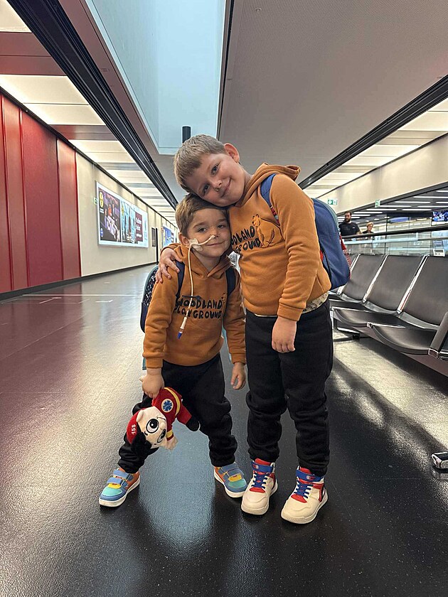 Nemocný Kubík se svým starším bratrem na letišti ve Vídni před odletem do Bostonu.