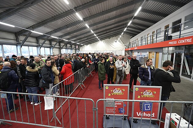 V pražských Letňanech probíhá výprodej pořádaný společností Lidl. Akce přilákala velký počet návštěvníků, kteří si odnášejí plné nákupní košíky. (12. prosince 2024)