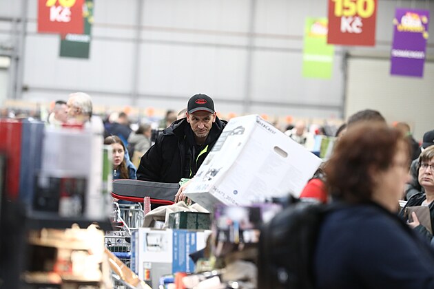 V pražských Letňanech probíhá výprodej pořádaný společností Lidl. Akce přilákala velký počet návštěvníků, kteří si odnášejí plné nákupní košíky. (12. prosince 2024)