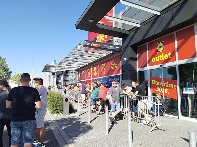 Před outletem Lidlu v Olomouci se vine dlouhá fronta.