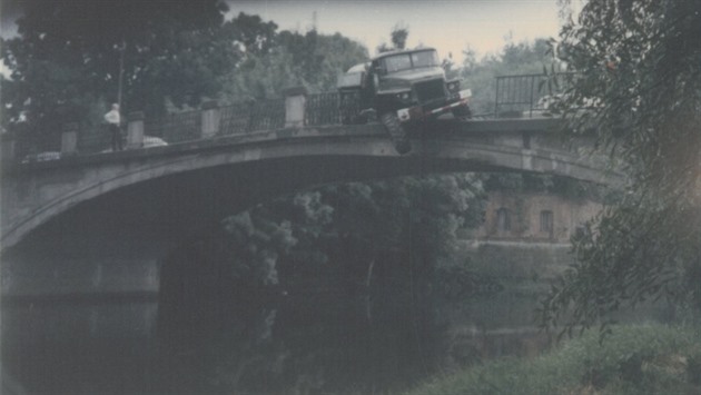 Před očima měl jedinečnou scenérii, nabourané nákladní auto sovětských okupantů. Skrz proražené zábradlí trčelo nad řekou, Odstrčil jako nadšený fotograf nemohl odolat.