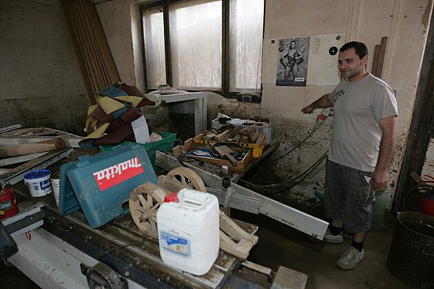 Jeden z obyvatel olomoucké čtvrti Slavonína ukazuje, jak vysoko sahala 7. srpna 2010 hladina říčky Nemilanka po silném přívalovém dešti.